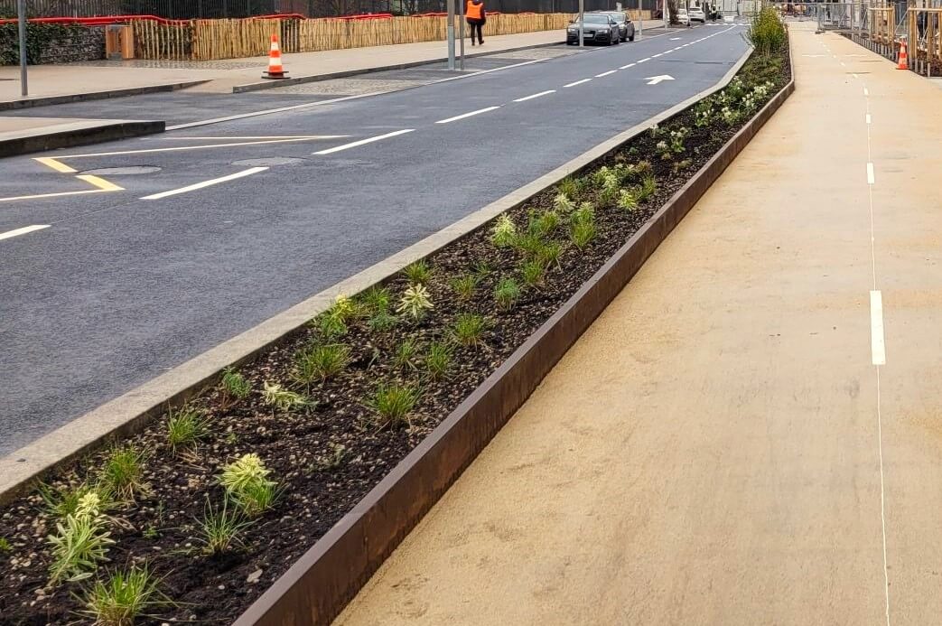 "Die Cortène-Randsteine ermöglichten es uns, die Lösung in ein denkmalgeschütztes Gelände zu integrieren, ohne ein Gramm sichtbaren Beton...".